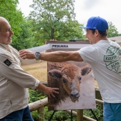 Foto 1: Odhalení jména nemladšího přírůstku ve stádě zubrů v Zoo Praha se společnými silami zhostili ředitel Zoo Praha Miroslav Bobek a vodní slalomář Jiří Prskavec mladší. Foto Petr Hamerník, Zoo Praha