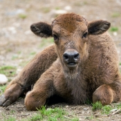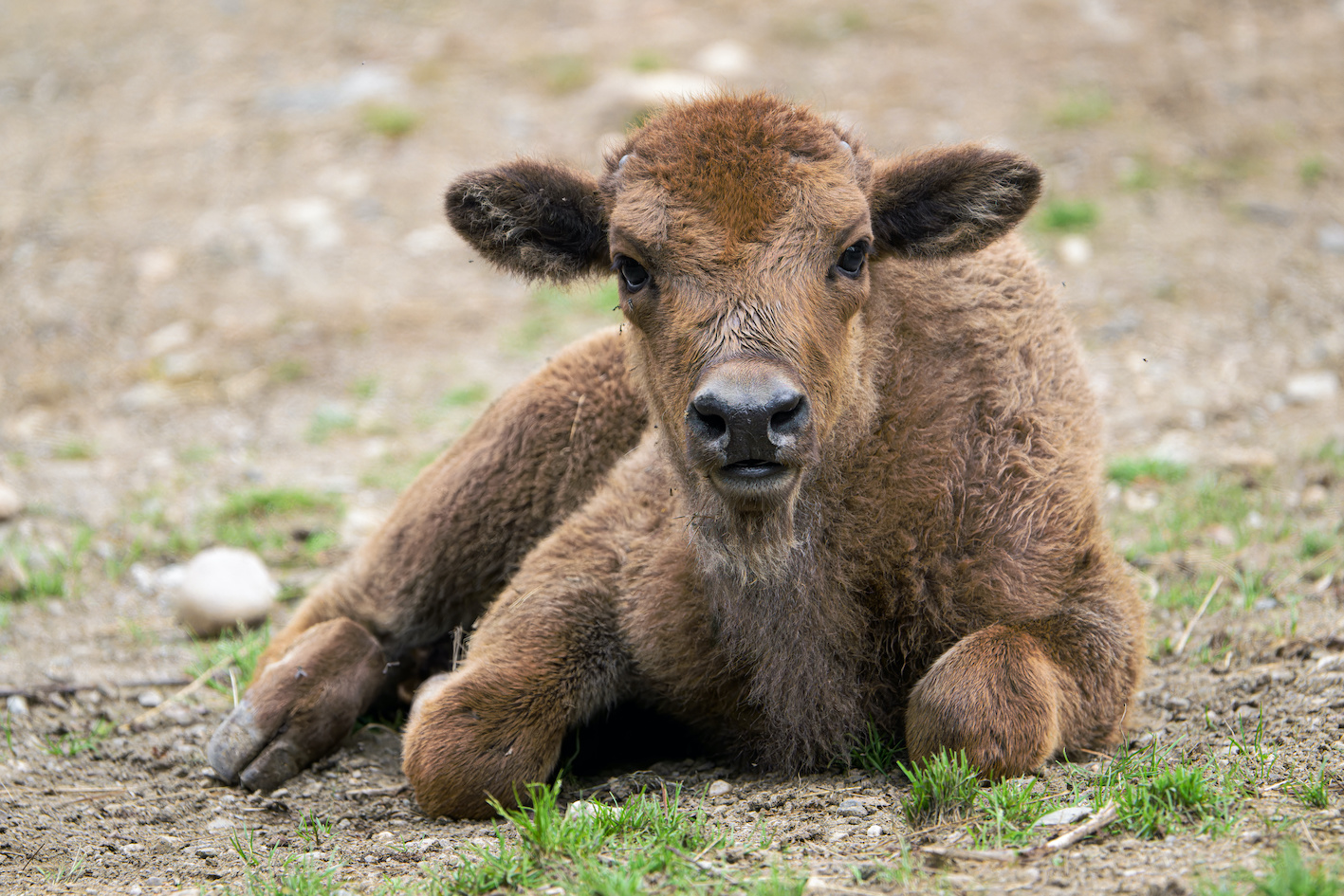 Foto 3: Dnes pětitýdenní samička zubra Prskavka se zpočátku projevovala jako velmi klidné mládě, které se nevzdalovalo od své matky Boženy. Nyní už se vydává i na samostatné průzkumy výběhu. Foto Petr Hamerník, Zoo Praha