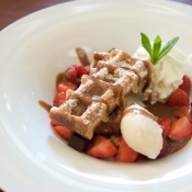 Sladkým hitem je v Bruxxu Bruselská vafle s čokoládovým želé, ovocem a sorbetem z pšeničného piva (95Kč).