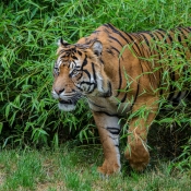 Foto 4: Tygr sumaterský Achilles rád prozkoumává vegetaci ve výběhu a rovněž miluje vyvýšené dřevěné palandy, ze kterých má dobrý rozhled po okolí. Foto Petr Hamerník, Zoo Praha