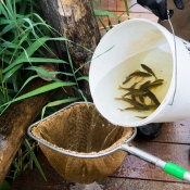 Foto 1: Odchyt mladých karasů obecných v rybníčku v Zoo Praha a jejich příprava na transport do pražské Michle. Foto Petr Hamerník, Zoo Praha