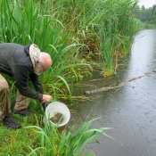 Foto 3: Kurátor plazů, obojživelníků a ryb Zoo Praha Petr Velenský vypouští kriticky ohrožené karasy obecné do retenční nádrže Interlov v pražské Michli. Foto Petr Hamerník, Zoo Praha